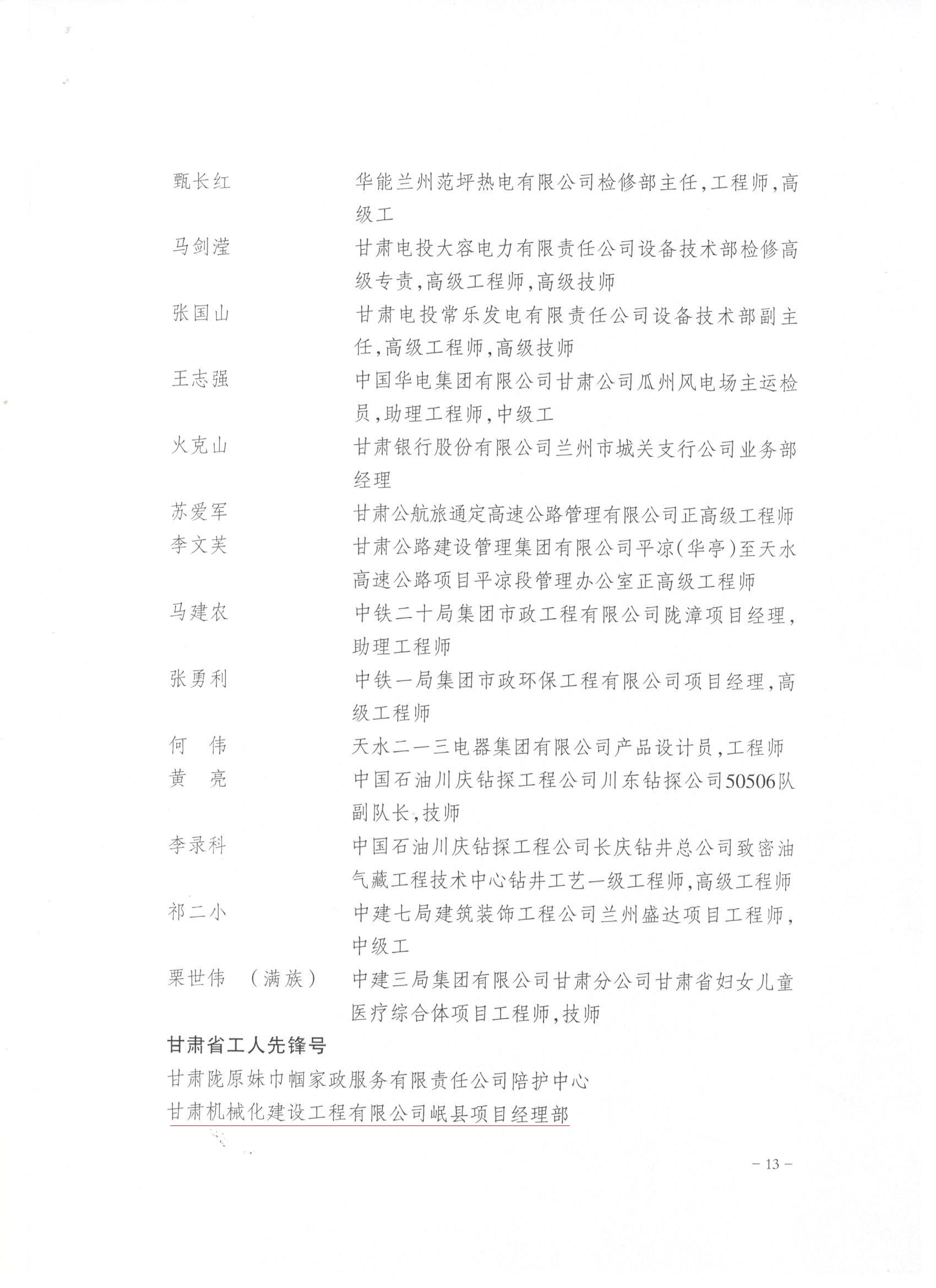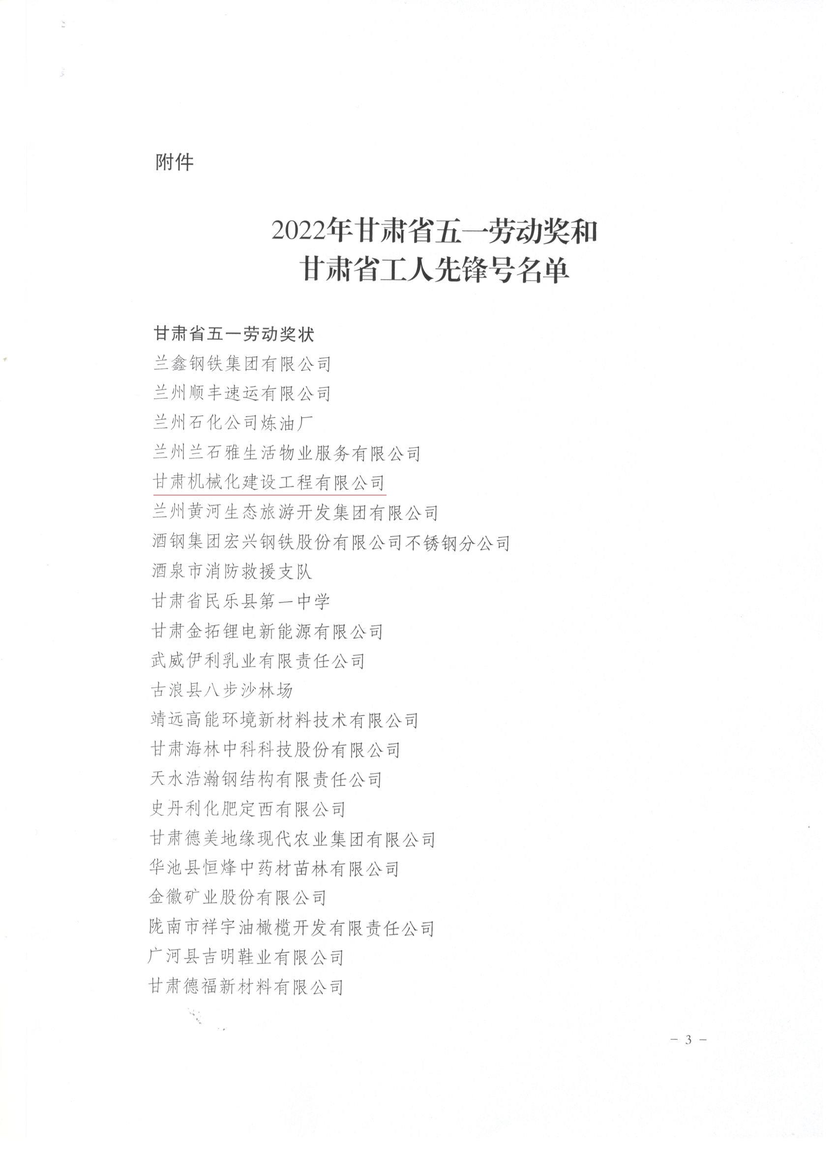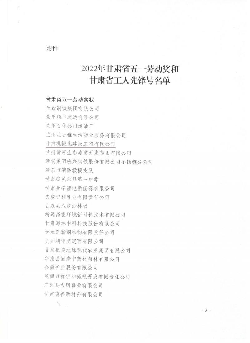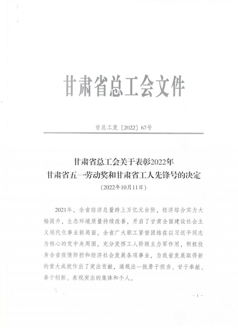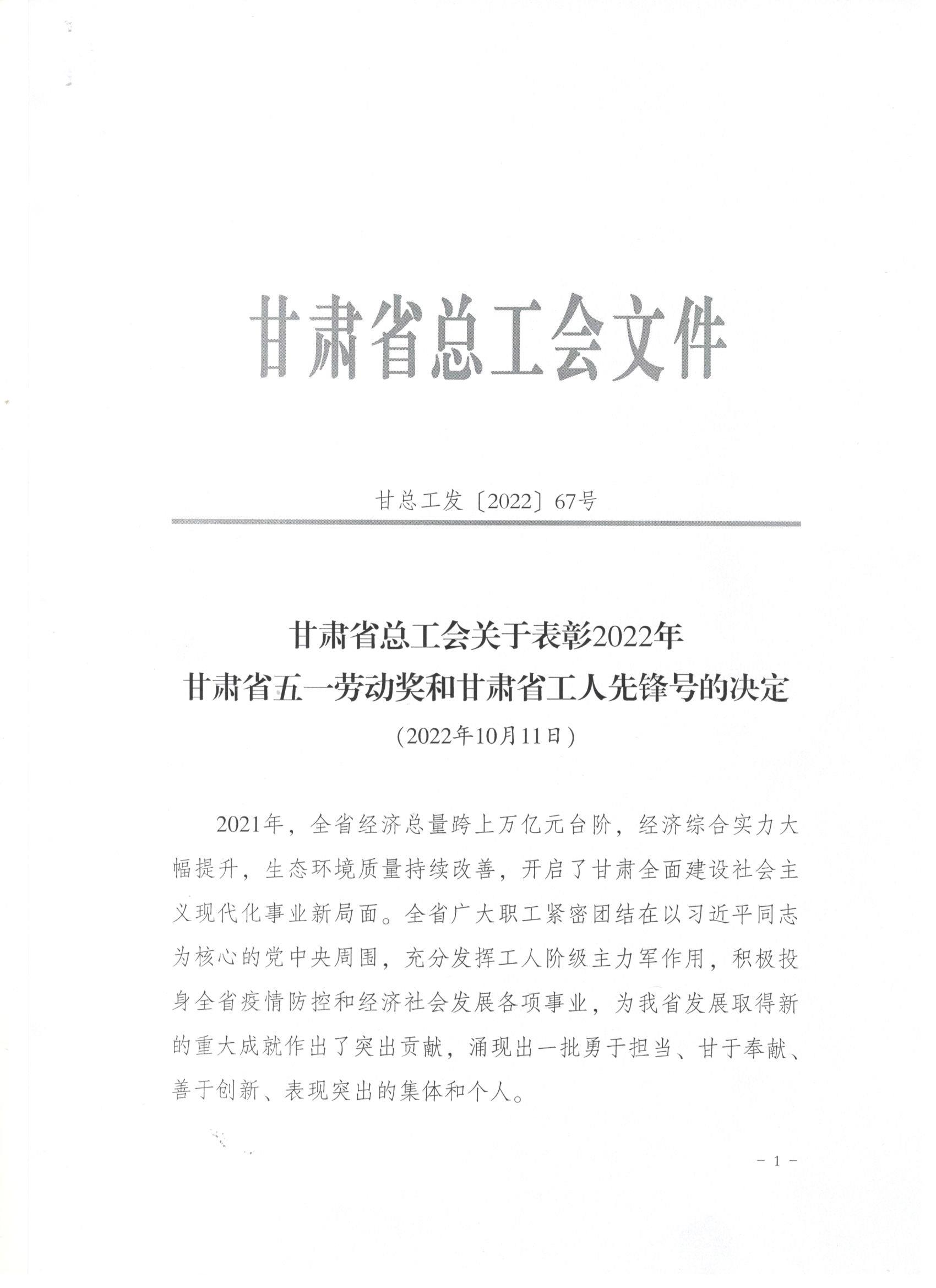 近日,甘肅省總工會發(fā)布了《關(guān)于表彰2022年甘肅省五一勞動獎(jiǎng)和甘肅省工人先鋒號的決定》,我司被授予“甘肅省五一勞動獎(jiǎng)”和“甘肅省工人先鋒號”。