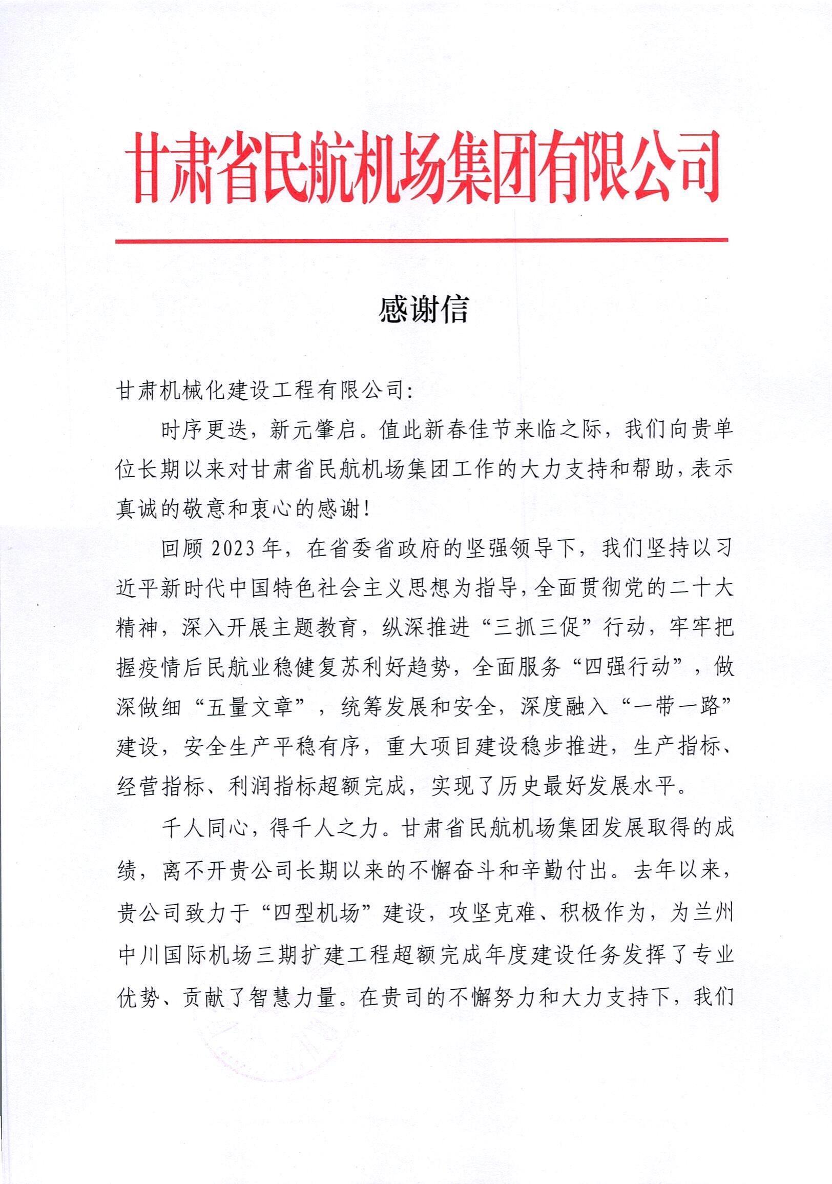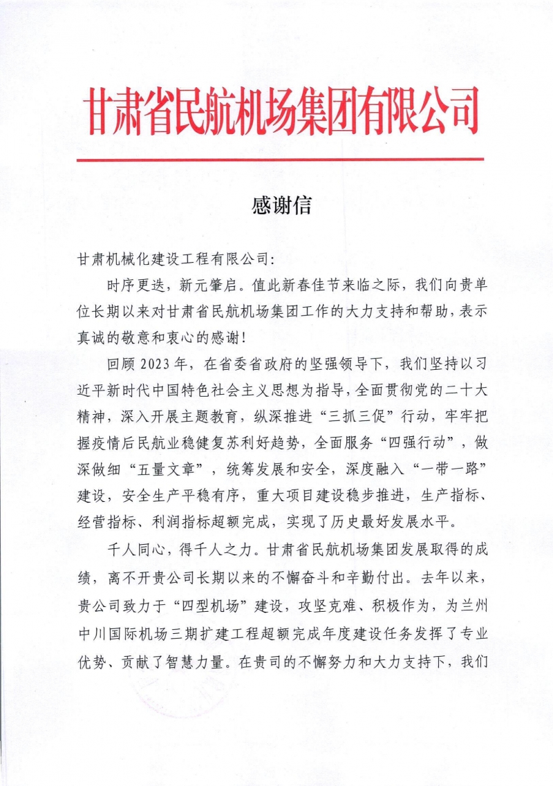 2月8日,新春佳節來臨之際,我司收到來自甘肅省民航機場集團有限公司的感謝信。