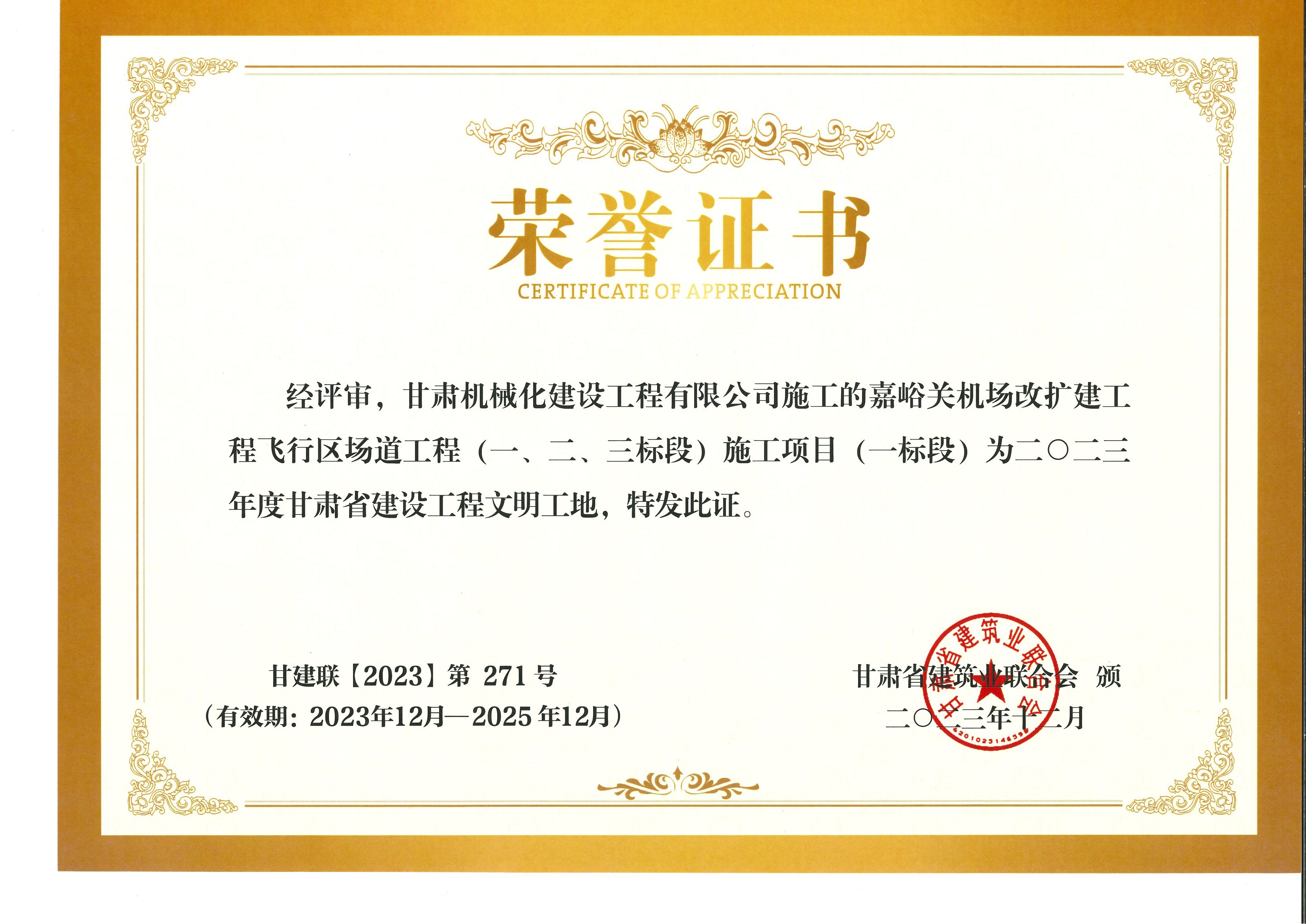 2023年度甘肅省建設工程文明工地 嘉峪關機場改擴建工飛行區場道(一、二、三標段) 施工項目 (一標段)